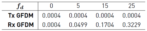 The numerical results of the symbol error probability were obtained using only [24], [25], [27] and [28]. The effects of the GFDM parameters (N, M, α) and the channel parameter fd over the symbol error probability of receiver GFDM are depicted in Figures 7 - 10, respectively. In order to make comparisons, all these figures also show the error probability of the receiver GFDM corrupted only by AWGN. These figures reveal that the presence of a time-varying channel (underwater acoustic communication channel) seriously degrades the symbol error probability of the system.