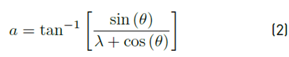 From the analysis of the velocity triangle [Figure 1], a relation between the attack angle α, the azimuth angle θ, and the tip speed ratio (TSR) λ was defined; this relation is given by Equation (2).