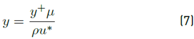 Where y+ value indicates the wall spacing in (m), dynamic viscosity μ, fluid density ρ, and dimensionless velocity u∗.