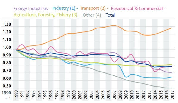 Unfortunately, the EU transport sector still remains heavily dependent on oil resources and, therefore, it is responsible for a large part of the air pollution. Figure 1 shows the variation of CO2 emissions from different sectors from 1990 to 2017, using 1990 as the base year. Contrary to the other sectors that have been reducing their emissions, the transport sector has been increasing these emissions in the last years. In 2017, the greenhouse gas (GHG) emissions from the transport sector reached 22% of the total European GHG emissions and 27% when including international aviation and maritime emissions[5].