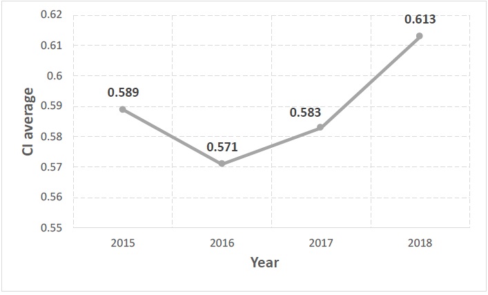 The average of the sustainable performance had only small variations through the years. It decreased by almost 3% in 2016 when compared to 2015, but began to increase in 2017. By 2018 the CI average was 4.09% above 2015 levels. Twelve units were efficient in this analysis, i.e., have a CI score of one: Denmark (in 2017), Latvia (in 2015 and 2018), Hungary (in 2015, 2016 and 2017), Netherlands (in 2015, 2017 and 2018), Romania (in 2015) and Sweden (in 2017 and 2018).