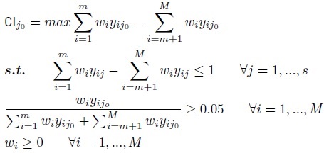 The model (2) has two kinds of restrictions. The first restriction imposes that no country can have a CI value greater than one, to ensure an intuitive interpretation of the indicator. The second restriction imposes that each weight attributed to the sub-indicators should be non-negative, which implies that the CI is a non-decreasing function of the sub-indicators. Consequently, the CI value obtained varies between zero and one for each assessed country j0, where higher values indicate a better relative performance [22].