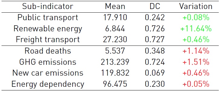 Analyzing the average variation of the forward sub-indicators between 2017 and 2018, it can be seen that there was an improvement in all of them. The share of public transport in total passenger transport had a slight increase of 0.08% between 2017 and 2018. The average share of renewable energy in transport presented the highest rate of improvement, increasing 11.64% in the last year. The share of freight transport had also a slight improvement in the last year in 2018, and was 0.46% above 2017 levels.