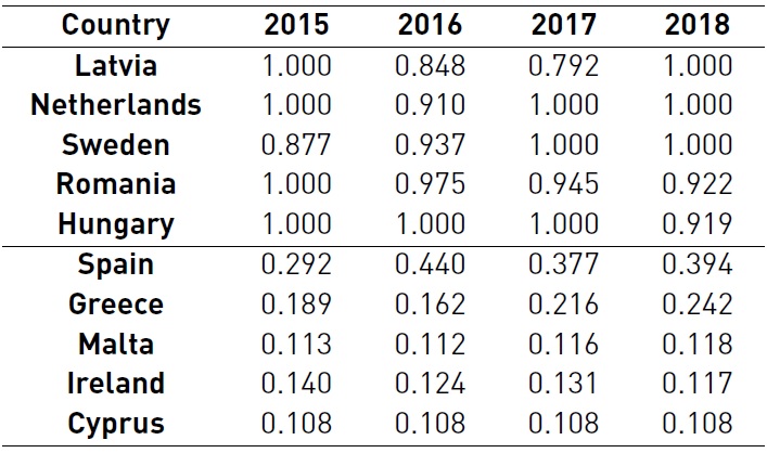 Table 2 shows the CI results from the top five countries, which had the highest CI score in 2018, and the last five countries, which had the lowest CI scores in the last year. Latvia and Sweden were already efficient in 2015, decreased their CI score in the following years, but by 2018, both were efficient again. Sweden increased its CI score by 14% between 2015 and 2018. Romania and Hungary decreased their CI score when compared to 2015 but still had high CI results. The highest improvement was observed in Spain and Greece, which increased their CI scores in 2018 by 34.9% and 27.6% above 2015 levels, respectively. Although, they still ranked among the five lowest performance countries. Malta had an improvement of 4% between 2015 and 2018. A high decrease of 16.1% was observed during this time frame for Ireland. Cyprus was the most inefficient country in this analysis and had no improvement during this time frame.