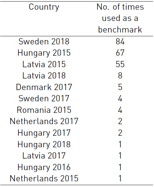 Sweden in 2018 was the benchmark unit most used by the inefficient countries to obtain their performance, followed by Hungary and Latvia in 2015. The other benchmarks were used in a much lower frequency.