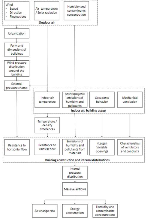 The influence of winds, in the sense of blocking, depends on the level of urbanization around buildings, the building form and dimensions, and orientation. As shown in Figure 1, these four factors mentioned before can be accounted for by a resistance to horizontal flow together with internal and external pressure distribution around the building. Similarly, the influence of the difference between indoor and outdoor temperatures can be accounted for by a resistance to vertical flow, which is dependant on the building height and opening sizes. The impact of all influencing factors related to the indoor air movements can be globally assessed in terms of three most parameters: (i) the air change rate, (ii) energy consumption, and (iii) air quality.