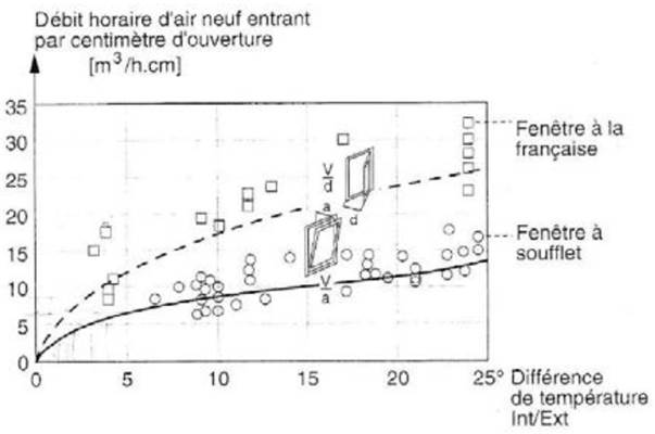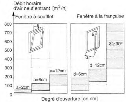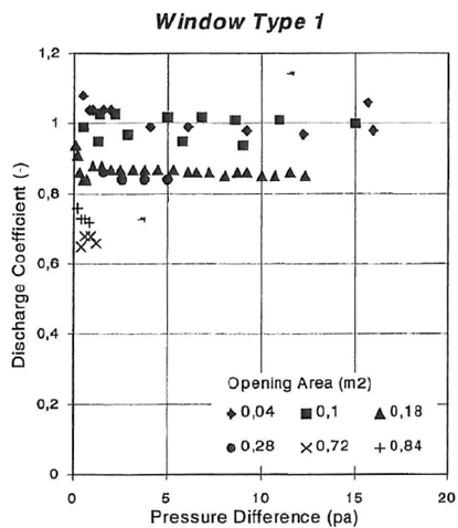 Daler et al. in 1982, as found in [33], reported the airflow capacity of bottom and side hung openings, for different opening degrees and as a function of a room indoor-outdoor temperature difference [Figures 7-8]. One of these types of openings, the bottom-hung window (also known as tilted window), is the same as the ones implemented in our test building.