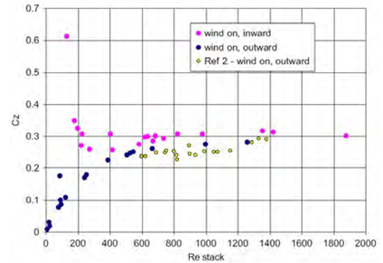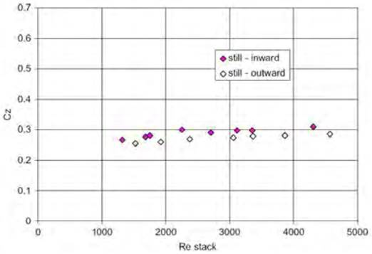 Costola and Etheridge in 2008 [36], performed pressure measurements in a scaled model in wind tunnel experiments, consisting of a stack and wind-assisted strategies. The scaled model included one small orifice at ground level and one stack opening at the top. They reported Cd values (named Cz ) for both the orifice and the stack opening, where the values of Cd for the former resulted in around 0.7 for either still air, or wind-assisted (0° and 180°) strategies; similar to those in Figures 10 and 7. However, for the stack opening, Cd values changed considerably depending on the Reynolds number, as shown in Figures 11 and 12, for still air and wind-assisted strategies, respectively. In the case of the still air strategy, the average Cd value was used, and in the case of the wind-assisted strategy, an average value from the constant region (from a Re of about 600) was taken.
