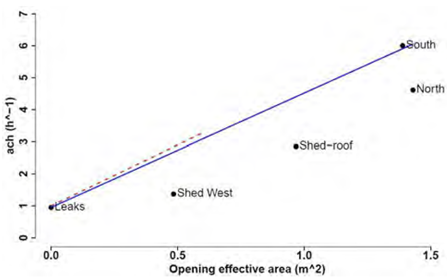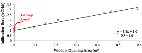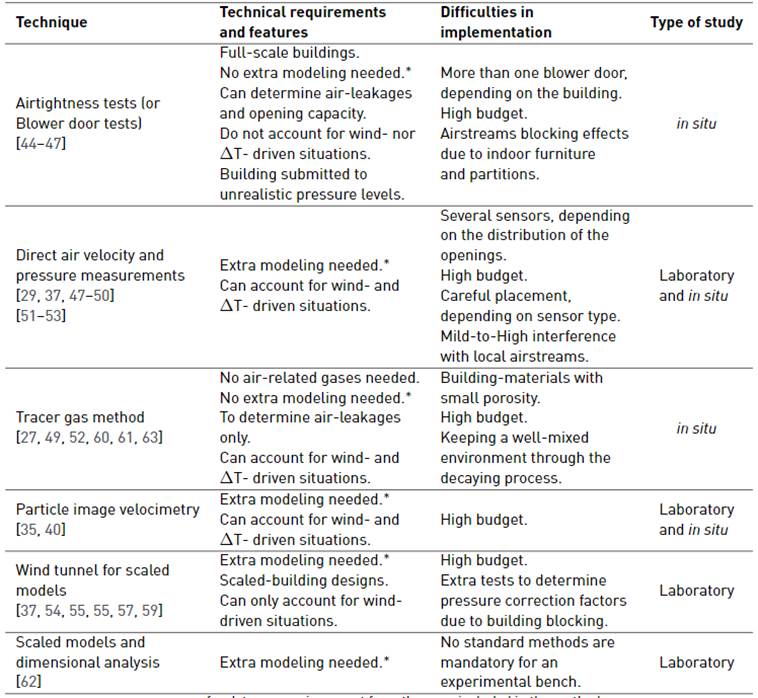 The most suitable experimental technique seems to be the airtightness tests since it allows us to obtain empirical Equations relating the ventilation airflow directly to the pressure difference in the building for both cases: infiltrations (openings closed) and openings opened. Also, the location of the leakages can be identified without complications, and this technique has the potential to estimate in situ the airflow capacity and friction characteristics of the openings.