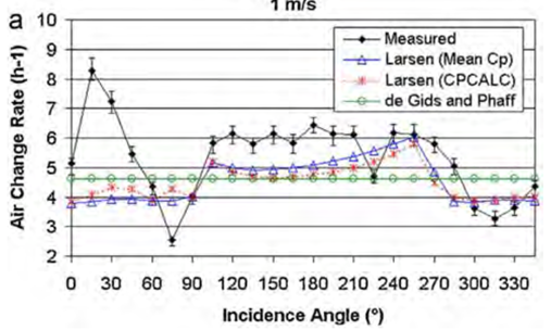 The authors in [55] (in an enclosure of 748 m3) and, in [54] (in an enclosure of 93 m3), compared measured data from wind tunnel experiments with different existing models, aiming to evaluate and improve the existing models for the case of single-sided ventilation [Figures 15-16].
