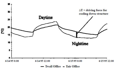 In regions with a significant temperature gradient between nighttime and daytime, night natural ventilation, if implemented adequately, arises as a good solution for the attenuation of the heat wave associated with the daytime period, leading to maintaining the thermal comfort for longer periods. Its application may be more attractive in office buildings, due to the absence of occupancy during nighttime. Its principle consists of cooling down the structure of the building when it is not occupied (nighttime), providing a heat sink that is available during the occupancy period (daytime). This heat sink absorbs the heat gains related to occupancy or equipment and maintains acceptable indoor conditions [11]. The cooling potential of nighttime ventilation can be assessed by the temperature difference between the indoor air and the surface of the wall [Figure 2].