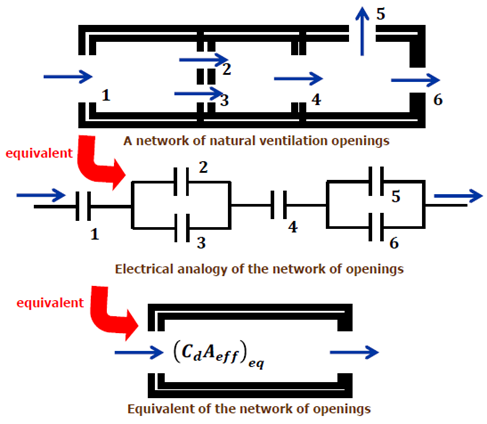 Another analytical approach found in literature is the electrical analogy approach, which is also employed for network airflow paths, avoiding the use of the Newton-Raphson’s method. This electrical analogy approach is based on an equivalent airflow resistance where the assumption that airflow paths are considered as capacitors [11], as shown in Figure 20. The equivalent airflow resistance of the example shown in Figure 20, results in the following Equation (22):