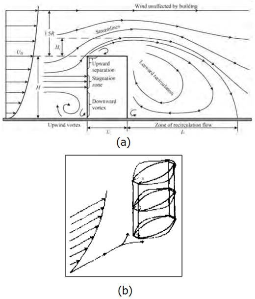In the case of wind-driven ventilation, to benefit the most from this natural force, it is recommended that the façade with openings of a building located in a windy place must be oriented perpendicularly to the wind direction, although not strictly necessary [23]. When the wind currents find in their path a building, a high-pressure zone is created over the windward side (or upside) of the building, and the leeward side (or downside) experiences an under-pressure zone [Figure 4 (a)). The other sides of the building (those in the wind direction) will also experience an under-pressure status [Figure 4 (b)) [22]. In general, the resulting dynamic pressure over the windward facade can be defined as a function of the wind speed using Bernoulli’s principle, as presented in Equation (1):