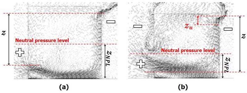 where Z represents the vertical distance from the lower edge of the lower opening (L) to the upper edge of the upper opening (U); with height zU [Figure 5 (b)). The vertical distance represents the height of the neutral pressure level (NPL), where the indoor-outdoor pressure difference is equal to zero, with respect to the floor. Different ways to determine this height have been reported in the literature [21,26,28]. For instance, the value of