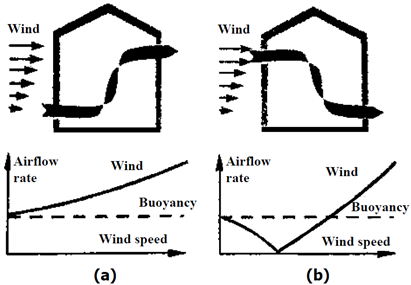 If placing the openings at the correct location, wind effects will join the thermal buoyancy effect, reinforcing the ventilation airflow rate. On the contrary, not placing them correctly or if the building is not correctly oriented, the wind will mitigate the thermal buoyancy effect reducing the building ventilation. This can be observed in Figure 6 (a), where the openings are correctly located, improving the airflow traversing the building. However, in (b), the openings are not correctly located, causing zero airflow (neutralizing both effects) at a specific wind speed value [21]. In this interaction, the wind turbulence effect is more important than in cross-ventilation configuration [29]. However, significant differences can be observed concerning the complexity of this interaction regarding theoretical or experimental approaches [30].