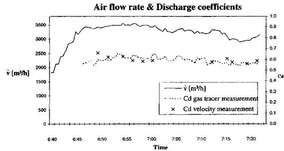 Heiselberg et al. in 2001 [35], performed airflow rate and pressure measurements at the opening in a laboratory set-up, and determined Cd values for openings similar to ours, using Equation (8) [Figure 10]. It was concluded that the use of a constant value could lead to serious errors in the prediction of airflow capacity, because their experimental results showed that the discharge coefficient changed with the effective area and the type of opening, as well as, with the temperature difference. Also, for the three types of opening they tested, the value of the discharge coefficient slightly decreases as the pressure difference increases.
