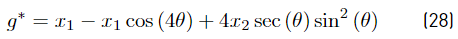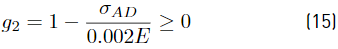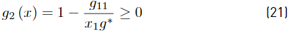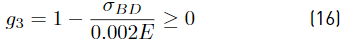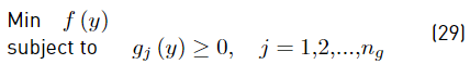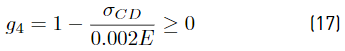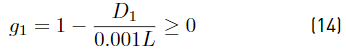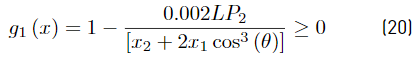 where ρ is the mass density. The truss is designed in subjection to 5 constraints shown in Equations (14) to (18); g1 corresponds to the vertical displacement at node D and can not exceed a value of D2max = 0.001L. The g2 to g4 constraints are related to limits on the traction stresses σtmax = 0.002E and finally g5 is related to compression stress limit in the bar C-D σcmax = 0.0015E