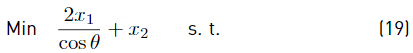 The combination of the P1 and P2 forces can represent the components of any force acting on node D; however, only positive forces are considered here according to the directions described in Figure 1. The presence of the positive P1 and P2 forces implies that the normal stressin the A-D bar is always Positive, but the stress in the C-D bar can be positive or negative. For the sake of model reduction, some symmetries are introduced: the sectional areas and rotation angles of the lateral bars of the A-Dand C-D nodes are equal; they are AAD = ACD and θAD = θCD respectively. The new design variables are x1 = AAD 0.002E, x2 = ABD0.002E, θ = θAD = θCD . The optimization problem consists of finding a minimum-mass design for the truss, given by (13)