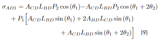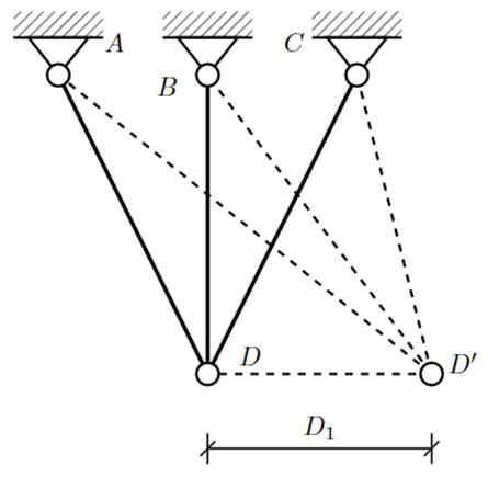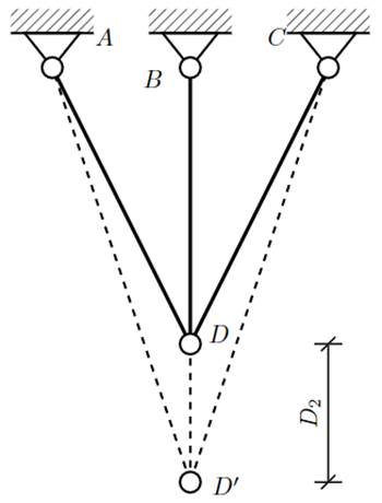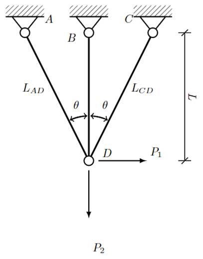 Figure 1 shows the mechanical system analyzed herein. The sectional areas and normal stresses in the lateral bars between nodes A-D, B-D and C-D are AAD , ABD , ACD and σAD , σBD , σCD , respectively. The A-D and C-D lateral bars show rotations θ1 and θ2 with respect to the vertical B-D. The B-D bar features length L, and the lateral bars feature lengths LAD = L/ cos (θ1), LCD = L/ cos (θ2). All the bars are built from the same linearly elastic material featuring modulus of elasticity E. It is clear that the truss has only two degrees of freedom for joint translation, namely the D1 and D2 horizontal and vertical translations at joint D, as shown in Figures 2 and 3.
