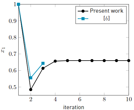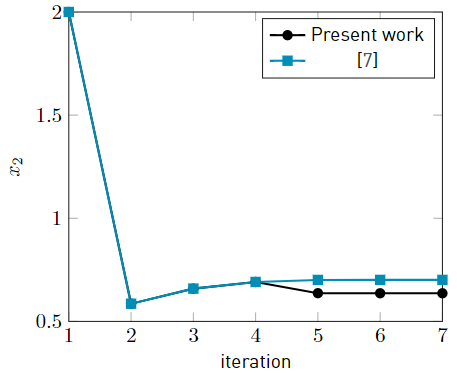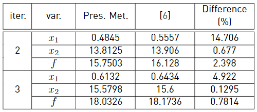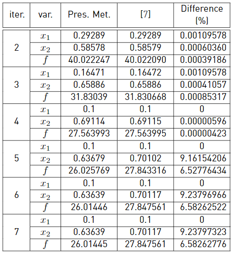 Regarding the second example, Figure 6 shows a separation between the plot lines from the 5th iteration; such difference is around 0.101%. The difference in the values of the cost function is remarkable. The results for the 7th iteration by [7] are f = 27.847560; for the values here presented, they are f = 26.014459, the difference being 6.58%.