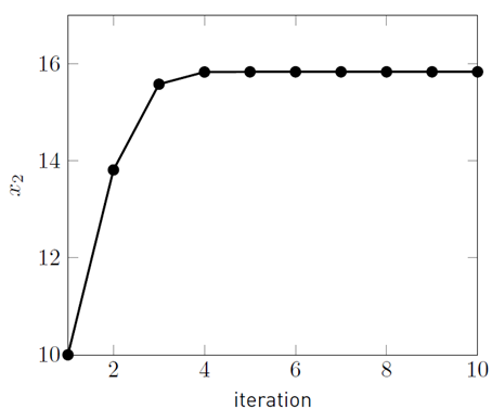and two restrictions: the vertical displacement and the stress in the A-D bar; these are Equations (19) and (21). This example also considers P2 = 8P1, θ = π/3 and x0 = (1, 10)T as a starting point. The reference shows the results only for the first three iterations. They are shown in Table 1 below, where the maximal difference between [6] and the results obtained here is 14.7% at the first iteration when estimating x1. Figures 4 and 5 show the plotted values for the first 10 iterations. It widely shows the fast convergence to the limit values of x1 = 0.6598, x2 = 15.835 and a cost function f = 18.474358.