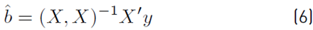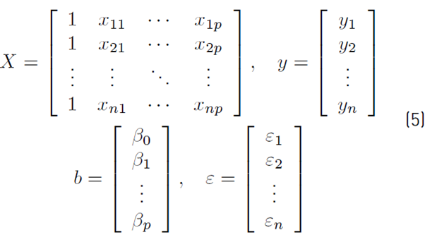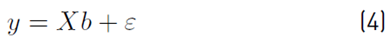 The matrix X is of size nx(p + 1) where n ≥ p + 1, vector y is nx1, vector b is (p + 1)x1 and vector ε is nx1. Where n represents the total number of experimental points, p represents the number of parameters βj of the regressor variables xi1, xi2, . . . , xip, β0 represents an additive constant that, since there are no effects caused by the regressor variables, usually represents the mean of the response variable y. The estimator of vector b in expression (4) where X′ X is the variance-covariance matrix is defined, according to [16] by Equation (6).