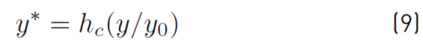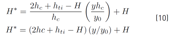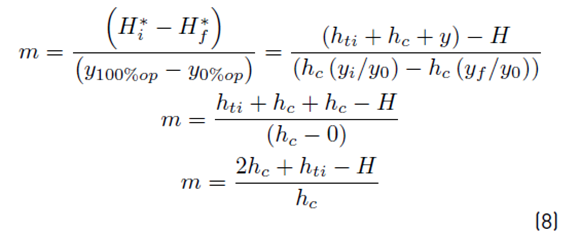 If y=hc (at 100% Opening, i.e., @ y/y0=1) and taken the sill as a “Datum of reference,” then the slope of this pressure line could be calculated by Equation (8):