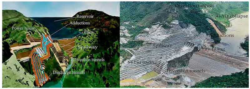 On April 28, 2018, two months prior to the starting of the scheduled fill of the reservoir, a collapse occurred [1,2], and the Río Cauca was diverted through GAD during the dam construction. This tunnel had been in operation for about seven months until a landfall blocked the tunnel access. This blocking resulted in the anticipated filling of the reservoir, exposing the dam and the spillway to the risk of overtopping. At that time, the level constructed of the dam was 385.00 masl (77% of the total height). The level of the spillway is at 401.00 masl, and at the entrance of the intake structure, it is at 350.00 masl. Because of the existed adverse condition at that time, on May 10, 2018, it was necessary to divert the water through four of the eight adduction tunnels of the intake structure (1, 2, 7, and 8), aiming to prevent the overflow in the dam and the spillway. At that time, the powerhouse was not finished, the connection of penstocks and spiral cases of the turbines was not over and so the diversion lead to the flooding of the machines' room.