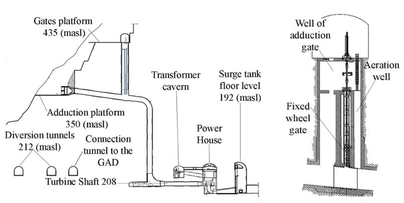 Hidroituango dam is a hydroelectric project constructed in the Río Cauca basin in the North of the Department of Antioquia (West of Colombia). It is a 220 m high Earth-Core Rock-fill Dam (ECRD) with the following design parameters: a reservoir of 2700 Mm3 with regular operation on 420.00 masl (meters above sea level); a spillway designed for a discharge capacity of 23,250 m3/s under four radial gates; an intermediate discharge tunnel with a capacity up to 450 m3/s; and three diversion tunnels (the last one is called theGalería Auxiliar de Desviación or GAD). The intake structure is made up of two submerged civil structures with four independent penstocks; each one of them has a diameter 6.6 m. Fixed trash racks allow the flow of water to the eight turbines/generator assembly fixed in vertical axes in the powerhouse, which are connected with two surge tanks downstream and four discharge tunnels. The flowing water returned back to the Río Cauca through the discharge tunnels. Figure 1. shows a general schematic diagram of the project.