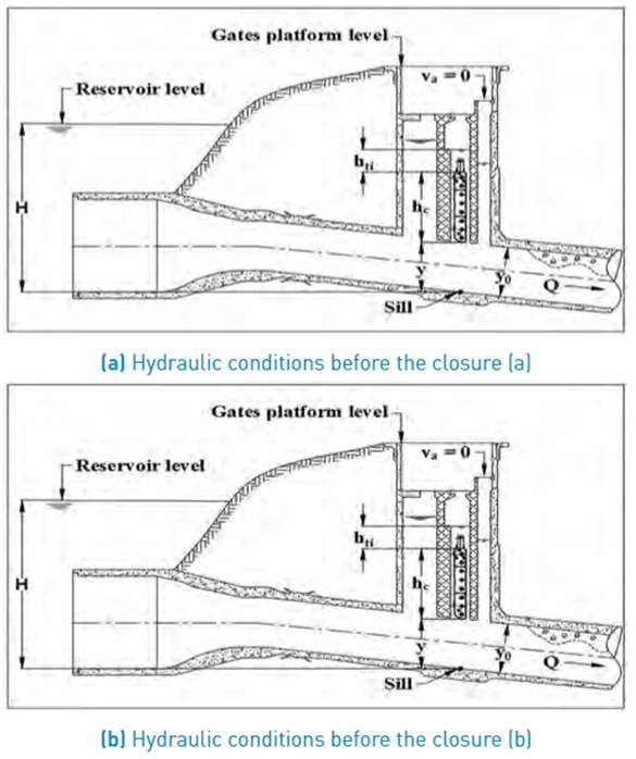 Water flows as a free surface flow through the tunnel before the closure the gate. Flow can be a mixture of air bubbles and sediments entrained at the intake adductions. The maximum flow velocities could be near 30 m/s for water and 70 m/s for air. When the gate is closed, the free surface flow is disturbed adversely, and the sudden fluid-structure interaction leads to sudden pressurization, with instantaneous pressure fluctuations due to transient flow behavior and highly turbulent air-water flows, thus leading to extensive stress on the reinforced gate.