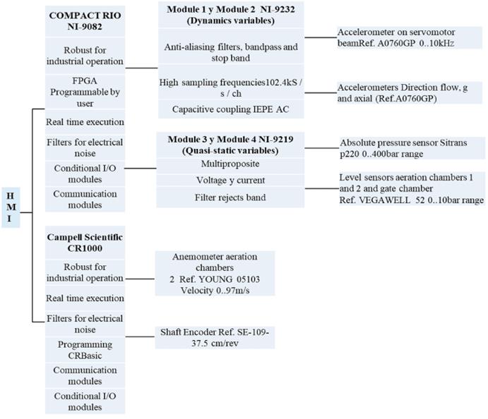 A system was developed to adequately monitor and record the critical variables involved during the closure. The most important one is hydrostatic pressure through water levels in the gate and aeration wells. Further, air velocity, acceleration of the gate in three orthogonal directions, and pressure in the annular chamber of the servomotor are also monitored. These variables were grouped into two categories based on the nature of their variations: dynamic and quasi-static variables. The quasi-static signals are composed of frequencies less than 2 Hz, while the frequency content of the dynamic signals can be extended up to 500 Hz. This classification helped and guided the specific development of the hardware and software components.
