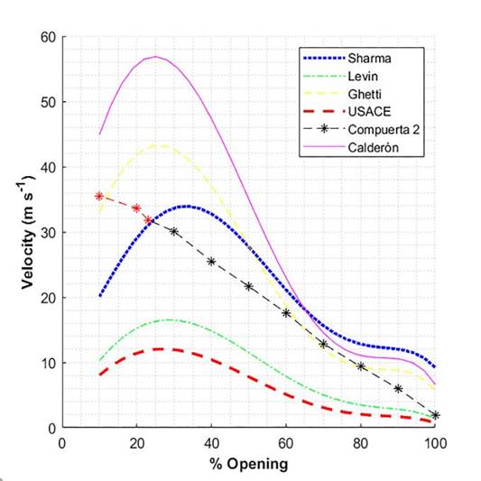 Based on the results presented in figure 9, it can be deduced that the aeration associated with the closure of gate N°2 showed a behavior very similar to that estimated with the Ghetti and DiSilvio equation up to 50% of the closure. Further, aeration was affected between 50% and 100% of the closure due to the connection between the pressure wells and the rock hollow.