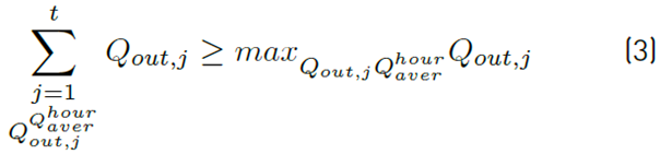 Based on the obtained results, a regularity was established that explains the relationship between the start of pumping and the extreme value - the minimum volume of the reservoir. Therefore, it can be concluded that the start time of pumping Tstart, the time at which the sum of all individual hourly water consumption Qout,j (less than the average hourly water consumption) is greater than or equal to the first individual hourly water consumption is greater than the average hourly water consumption [16]. Mathematically written, Tstart is the time t, 1≤t≤T for which it holds, shown in Equation (3) [18]: