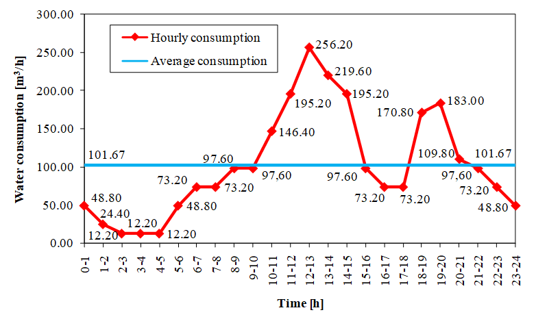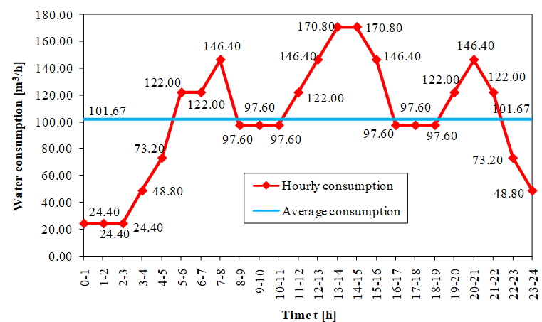 Also, two different water consumption regimes are observed through the example of a settlement of 8970 inhabitants for maximum daily water consumption (with all losses) Qdaily = 2440 m3/day, i.e., Variant I and Variant II [12]. Required water volumes and water consumption quantities for both Variants are shown in Figure 1 and Figure 2.