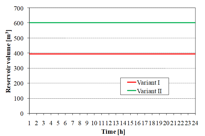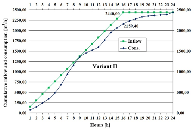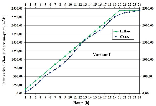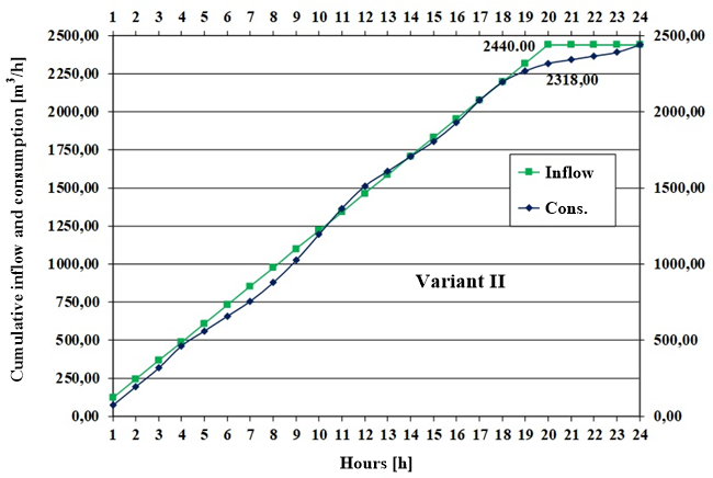 For the stated extreme values that occur in both Variants, calculations of cumulative water inflow into the water reservoir and water consumption with pumping start at 3 AM and 4 AM, for pumping duration of 20 hours for Variant I, and at 6 AM for pumping duration of 16 hours were made for Variant II.