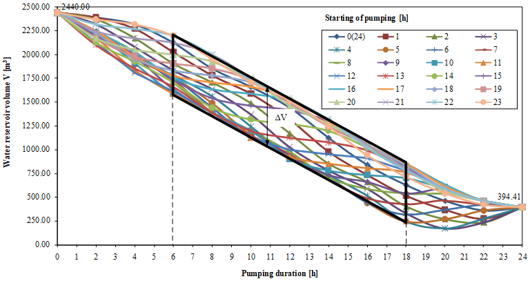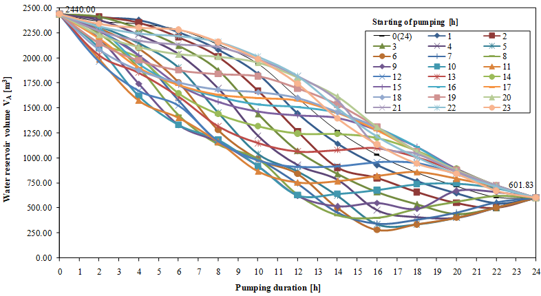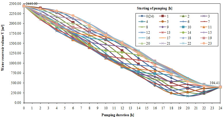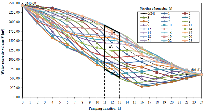 In the case of occasional water abstraction, such as different durations and different abstraction starts, reservoir volumes were calculated for the maximum daily water consumption of = 2440 m3/day, for Variant I and Variant II, in order to find their impact on the reservoir volume. The mentioned calculations, with respect to the different beginnings and durations of pumping for Variant I are shown in Figure 4.