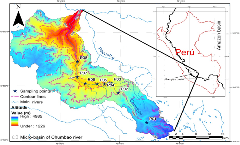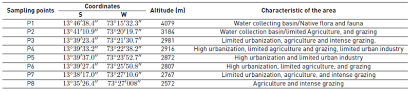 Point samples of water were taken from 8 points along the river, from the head of the basin (13° 46'38.4” S, 73° 15'32.3” W, and 4079 m of altitude), to the area known as Sotoccmachay (13 35'26.4” S, 73° 27'00.8” W, and 2572 m of altitude) (see Table 1], during the rainy and dry seasons.