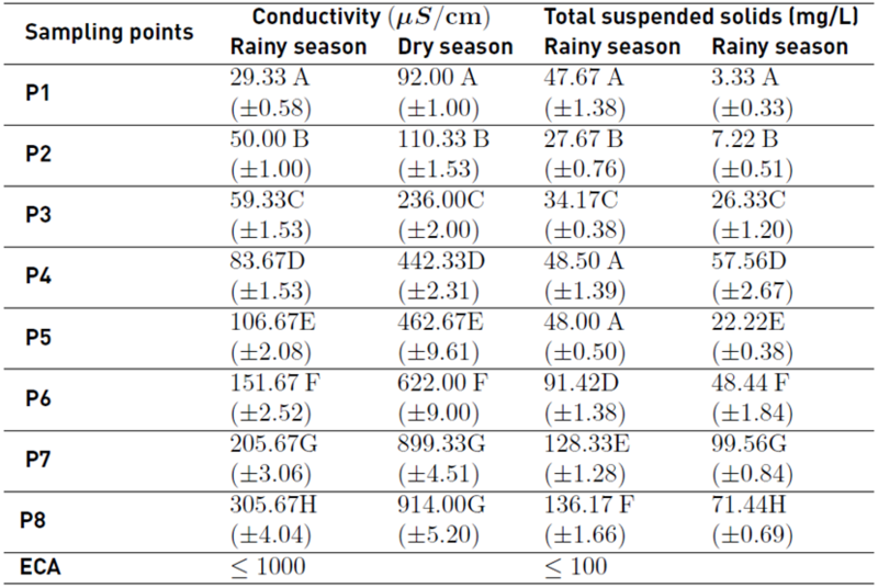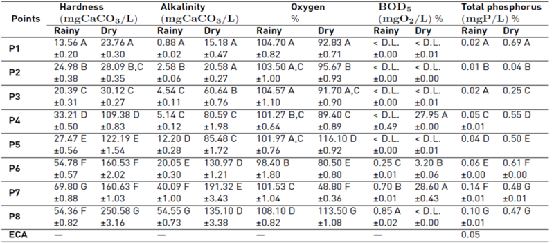 On the other hand, totals suspended solids reported in the rainy season ranged from 27.67 to 136.17 mg/L, and from 3.33 to 99.56 mg/L in the dry season, showing a significant difference (p-value < 0.05); all the sampling points of both seasons except for points P7 and P8 in the rainy season presented acceptable values according to the ECA [10]. It was also appreciated that the values reported in rains were higher than in the dry season; this is attributed to the slope of the river, which increases the surface runoff from the area adjacent to the river, transporting sediments such as clays, silt, organic and inorganic matter, making the water turbid [33], affecting the passage of light, and limiting the development of aquatic life [34].