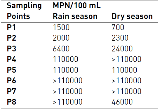 Table 7 shows the level of total coliforms at the sampling points; a considerable increase was observed from P3 in both seasons, indicating anthropic activity, mainly due to the presence of livestock stables near the banks of the river in P3 and P4; likewise, a considerable increase of 11x104 MPN/100 mL was observed from P4, largely due to the discharge of domestic wastewater, and animal slaughter beds, whose used water is discharged directly into the river without any treatment, increasing the microbial load mainly of thermotolerant coliforms [46,47].