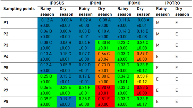 The determination of the IPOMO (see Table 8], in the rainy season, reported two valuations for pollution due to organic matter, P1 and P2 "none pollution", P3 to P8 showed "low pollution". In the dry season, P1 and P2 showed "none pollution"; P3, P5 and P8 "low pollution", P4 "high pollution", P6 "medium pollution", and P7 "very high pollution", the varied behavior in the dry season is related to the BOD level (see Table 6], those values were below the detection limit, and this would be due to the presence of pesticide and herbicide residues present in the water, which could cover the IPOMO values.