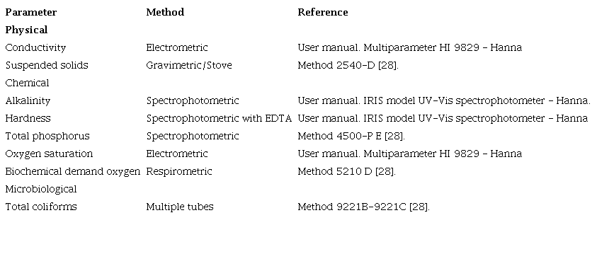 Physical, chemical, and microbiological parameters of the water were determined in the field and laboratory according to the methodologies shown in Table 2; the analyses were carried out at the water control and analysis research laboratory of the José María Arguedas National University, Andahuaylas, Peru.
