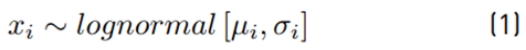 One of the most widely used works for the computation of the sum of lognormal random variables is the Fenton-Wilkinson method [7] due to its good results and the simplicity of its formulas. This method states the following: a random variable Xi follows a Normal distribution with mean mi standard deviation si. Xi ∼ Normal [mi, si], if xi then: xi ∼ lognormal [µi, σi ]. Where: µi= κ · mi, σi= κ · si and κ =