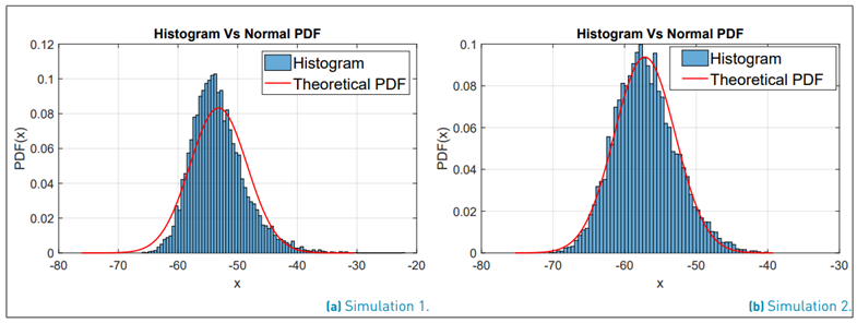 Explanation of Monte Carlo simulations 1 and 2 We’ll consider a scenario where N = 5 is the number of random variables to sum. 104 samples are generated for each of the five RVs Xi, i = [1, .., 5] using a Normal distribution function with parameters randomly selected within the range of an interference signal where m = [−80, −60] , and s = [4, 12]. The parameters selected for the mean value and variance were m = {−63, −61, −78, −61, −67}, s = {4, 5, 7, 9, 9} respectively. Then the following operation is performed: and finally we calculate