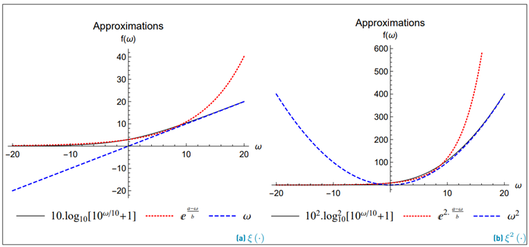 In order to improve the computational performance and the analytical treatment of the method proposed by Schwartz-Yeh, we need to find a function that approximates ξ (·) (Equation (17)] using a fewer number of terms. It also must be easily integrable. Therefore, the proposed solution in our work for ξ (·) is hereafter Equation (20) with the parameters: an, bn, ln , where n only takes the value 1 or 2 to indicate the 1st and 2nd polynomial degree, respectively. Figure 2 shows the comparison between Equation (20) against Equation (17) which evidences such an approach.