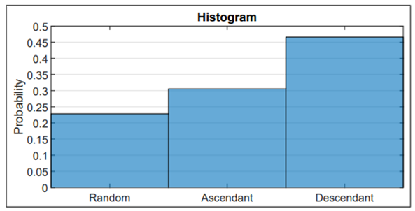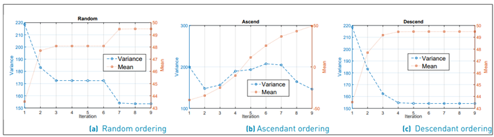 Finally, we choose the ordering with the smallest error. This procedure is done 106 times to know which ordering gives the smallest average error for the variance. To understand this phenomenon even better, as an example, we plot the evolution of µ˜ and σ˜2 in each iteration for each kind of ordering [Figure 3a-3c). The overall result is shown in Figure 4 as a histogram, where we can see that the smallest error occurs when the order is descending (with a probability of 47%).
