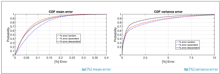 In order to give conclusions, we characterize statistically the behavior of the error metrics through their CDF. Figure 5 shows the CDF of the error for both metrics: the error of the mean value and the error of the variance for each ordering. It is noted that the error in the mean value µ˜ is below of 0.2% (with a probability of 90% of the time) in all orderings, while the error in σ˜ is below 3% (with a probability of 90% of the time) for descending order.