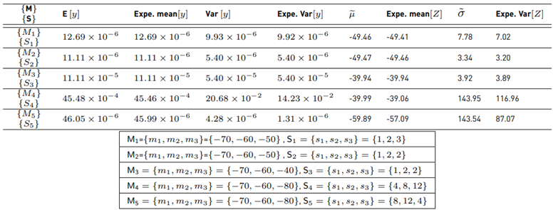 Then, we get the experimental ˜µ, σ˜. Analytically Equations (7) and (8) are used to get E [y] and Var [y]. After that, we use Equations (9) and (10) to find the theoretical µ˜ and σ˜. We compare both experimental and analytical results with different parameters mi , si. Those results are shown in Table 1.