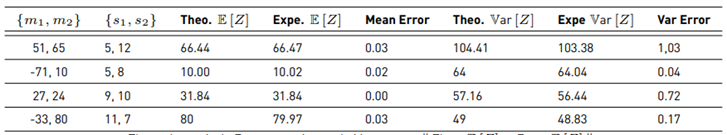 Explanation of Monte Carlo simulations 4,5 and 6 used to analyze Equations for E [Z] and Var [Z] We want to assess Equations 3 and 46 through simulations. Simulation number 4 analyzes the sum of only two lognormal RVs, N = 2. Then, we generate 107 samples for Xi following a Normal PDF with parameters mi, si and finally, we calculate Equation (49). From this result, we get the experimental mean value and variance. We repeat this procedure 4 times with different parameters mi and si.