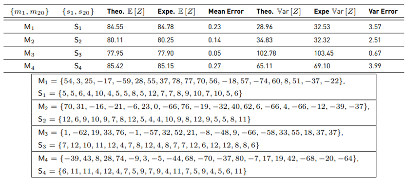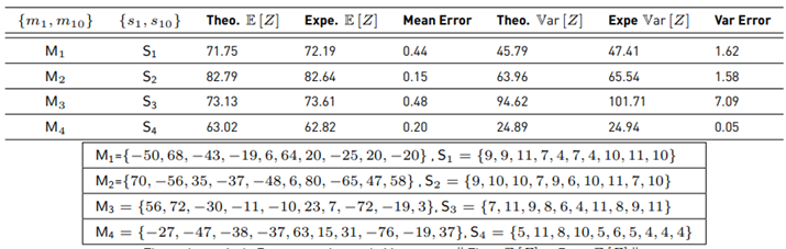Theo.=theoretical, Expe.=experimental, Mean error=∥ Theo. E [Z] − Expe. E [Z] ∥, Var. error=∥ Theo. Var [Z] − Expe. Var [Z] ∥