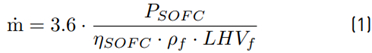 Where ṁ is the volumetric fuel flow of the SOFCEV in m³/h; PSOFC is the SOFC power in kW; ηSOFC is the average efficiency of the SOFC with heat recovery; ρf is the fuel density in kg/m³; LHVf is the fuel lower heating value in MJ/kg.